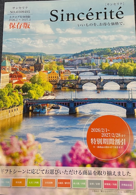 只今 出産祝い、内祝い、快気祝い、長寿のお祝い、法要などさまざまなシーンに寄りそう贈り物が掲載されてる特別割引のカタログを準備しております。お気軽にお声かけください。